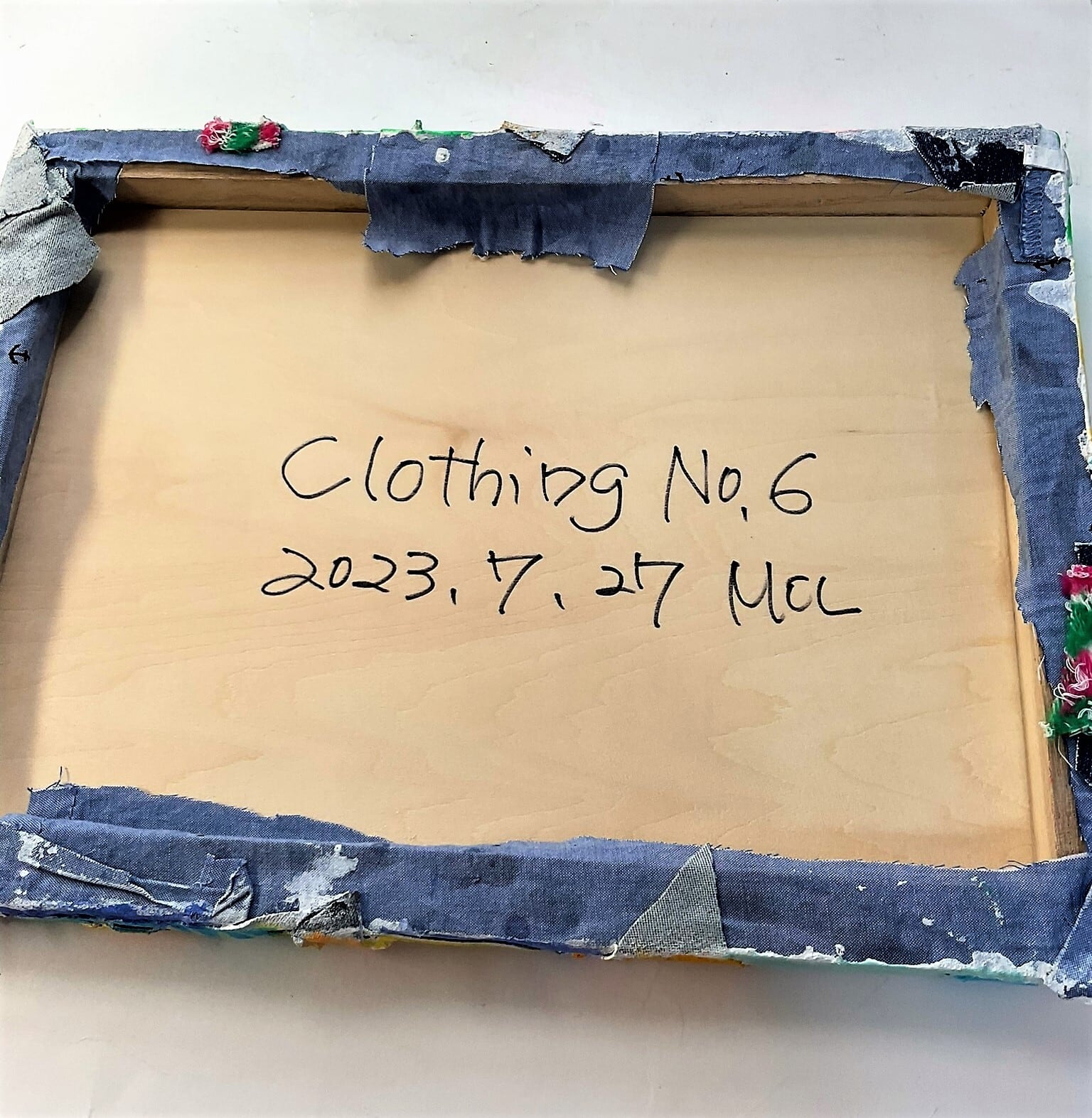この作品は廃棄予定のTシャツなどの生地を切って、木製パネルに張り付け、ジェッソ(セメントみたいな下地材)でカチカチに固めた自家製キャンバスに描いています。
